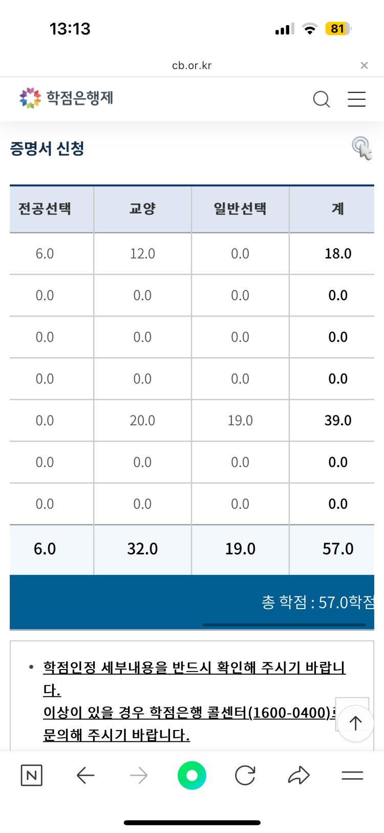 전공선택 6학점, 교양 32학점 , 일반 19학점으로 총 57학점입니다.